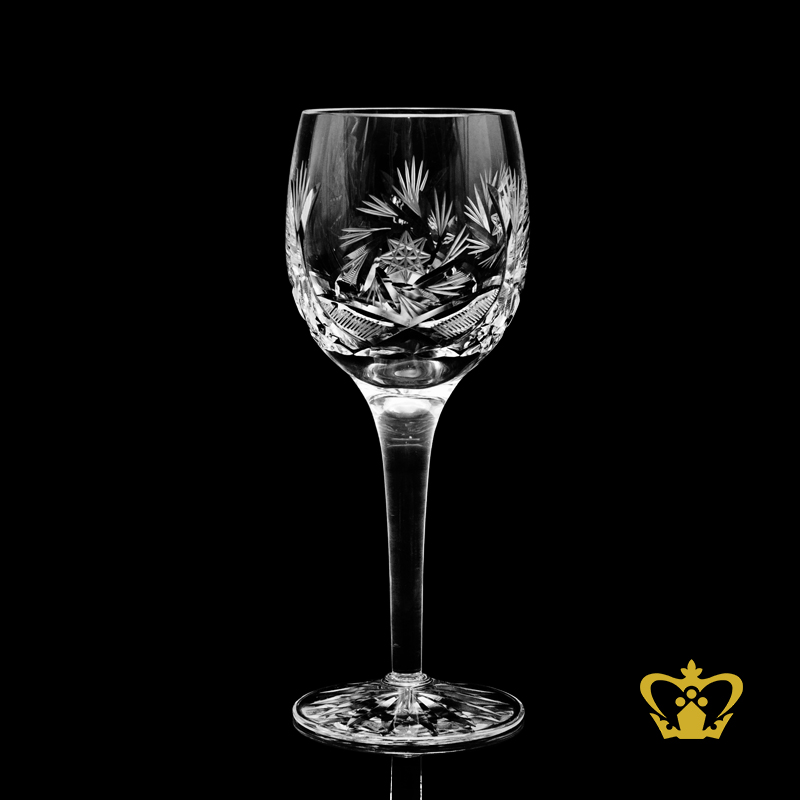 An elegant wine glass decorated with twirling star leaf cuts that adds to the brilliant sparkle