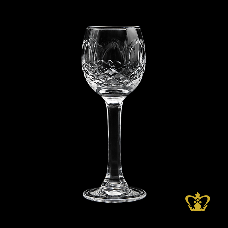 Crystal sherry glass with long stem and handcrafted diamond mehrab cuts on the goblet