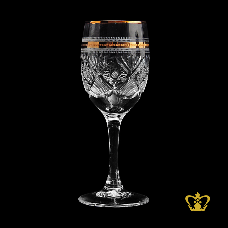 Charming crystal sherry glass with classic golden rim hand carved intense exquisite pattern 2 oz