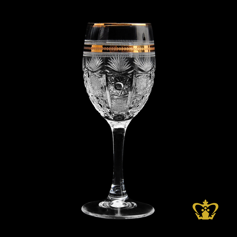 Alluring crystal sherry glass adorned with classic golden rim hand carved intense lovely pattern 2 oz