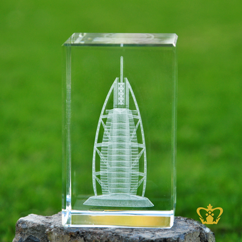The Burj Al Arab is the 4th tallest hotel in the world, standing a staggering 321m or 1,053ft tall. The Burj Al Arab (Arabic: Tower of the Arabs) is a luxury hotel located in Dubai, United Arab Emirates. You can personalize this crystal cube or rectangular crystal block by engrave your own photo, logo, text, design or any ideas. Click on customize button and upload your image or text and buy online, you can also click on enquiry button we will respond as soon as we can. To produce a 3D crystal, firstly our designers transform any of your ordinary photographs into amazingly 3D images. Then it imprinted or engraved in glass cube using our precision laser technology in crystal cube. 3D crystal cube or blocks are often used for 3D or 2D crystal portraits and given as gifts for wedding, birthdays, Valentine's Day, mother's day, father's day, graduation, convocation , remembrance, memorial or anniversary gift. There are also great corporate or business gifts for recognition awards, promotional paperweights and event mementos. Corporate logos laser engraved inside of the crystal make elegant client and employee gifts. These laser crystals accommodate 3D layered designs where text and image can be engraved at different depths in the crystal. You can add an optional light base and the interaction of the white LED light with the engraving creates bright and sparkling 3D keepsake.