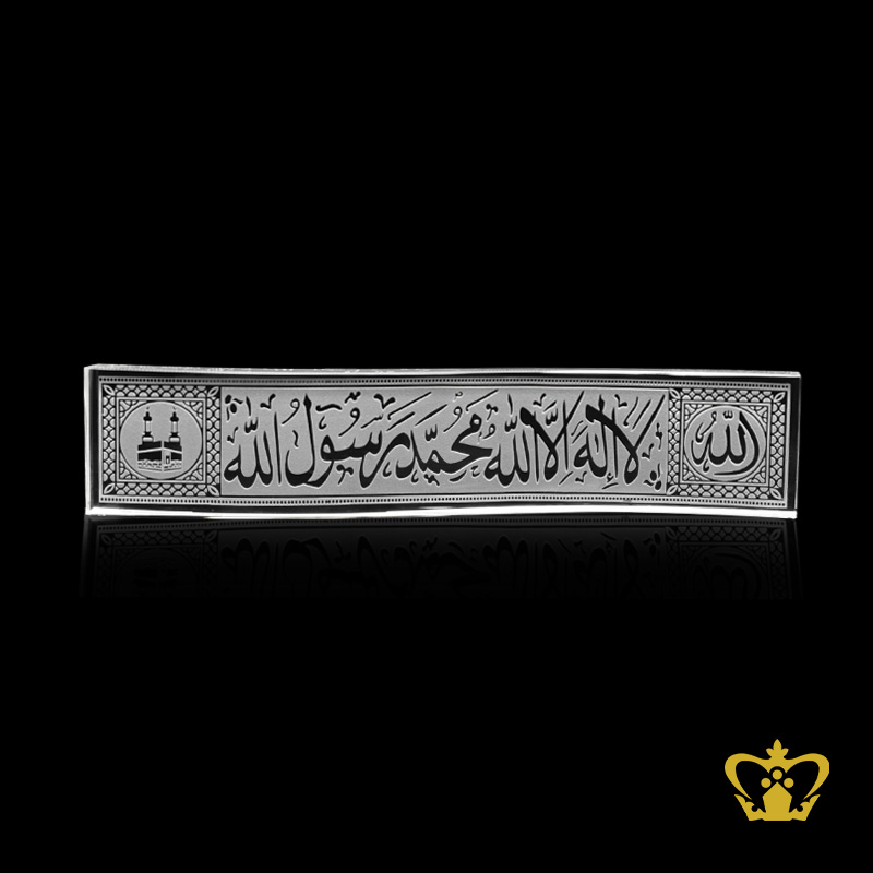 Crystal Gallery represent the craft traditions of the Islamic world with uncompromising quality and exceptional craftsmanship: to bring you a fine selection of unique handcrafted crystal corporate Islamic Gifts. Our Islamic artifacts gift decor collections are increasingly popular locally in Dubai, UAE, GCC and abroad. With a portfolio of high profile clients, our luxury giveaways have added the perfect awe-aspiring touch to many occasions and events. Our brand is widely recognized and endorsed by our clients for its classy Islamic gift collections and excellence of service. We design experiences in the world of luxury corporate gifts. This Modern Islamic Art handcrafted decorative item is the perfect addition to your home decor! Also can makes a great housewarming gift, Eid Gift, Ramadan Gift, Shahadah, gift for someone returning home from Hajj! "laa Ilaahah Illa Allah" And That " Muhammed Rasul Allah"there Is No God But God, And Muhammad Is The Messenger Of God. Personalized / Customized Content Such As Logos, Text Or Pictures Can Be Engraved / Etched On The Main Body Of This Product At An Additional Charge. "