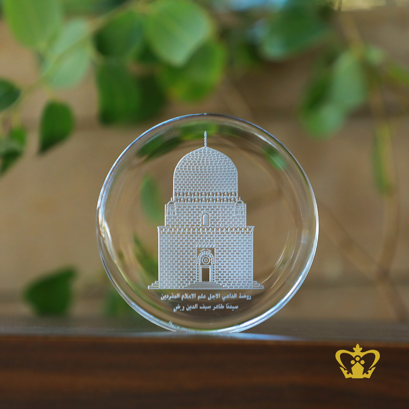 Crystal Gallery represent the craft traditions of the Islamic world with uncompromising quality and exceptional craftsmanship: to bring you a fine selection of unique handcrafted crystal corporate Islamic Gifts. Our Islamic artifacts gift decor collections are increasingly popular locally in Dubai, UAE, GCC and abroad. With a portfolio of high profile clients, our luxury giveaways have added the perfect awe-aspiring touch to many occasions and events. Our brand is widely recognized and endorsed by our clients for its classy Islamic gift collections and excellence of service. We design experiences in the world of luxury corporate gifts. This Modern Islamic Art handcrafted decorative item is the perfect addition to your home decor! Also can makes a great housewarming gift, Eid Gift, Ramadan Gift, Shahadah, gift for someone returning home from Hajj! Syedna Hatim bin Ibrahim al-Hamidi (died 16 Muharram 596 AH, 6 November 1199 AD), Al-Hutaib, Yemen) was the third Da'i al-Mutlaq (Absolute Missionary) of the Taiyabi Musta‘li Bohra Islam. He was of the Banu Hamdan tribe of Yemen and succeeded his father, the 2nd Dai Sayedna Ibrahim, to the religious post. This item is ideal for gift or souvenir also can Custom Branded With Your Logo and Designs.