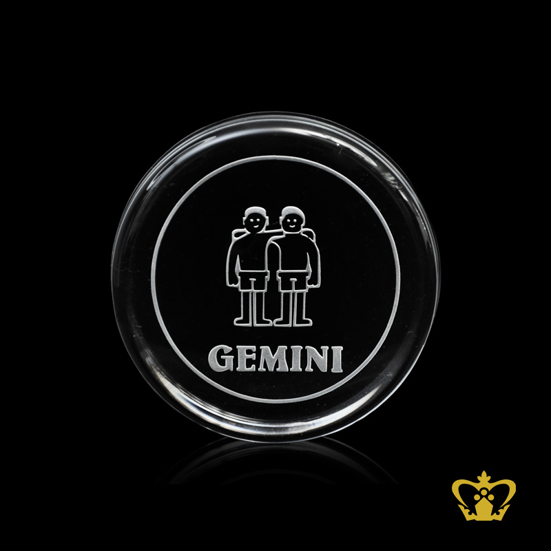 Artistic-custom-made-crystal-round-paper-weight-engraved-with-Leo-and-Gemini-zodiac-signs Product Product Product Product