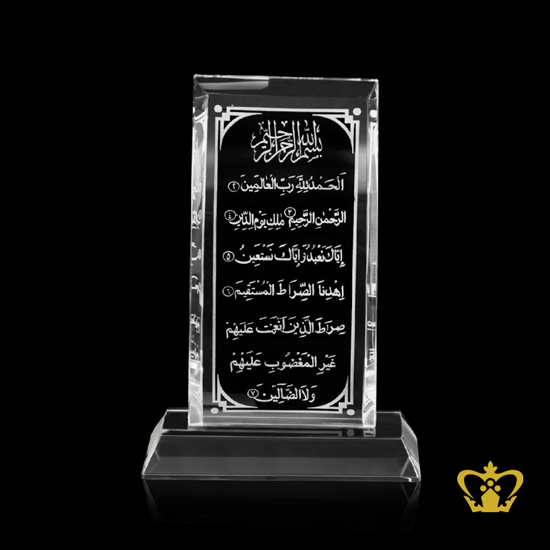 SURAH FATIHAH -The first chapter in the Quran is written upon a crystal crescent keepsake. Crystal Gallery represent the craft traditions of the Islamic world with uncompromising quality and exceptional craftsmanship: to bring you a fine selection of unique handcrafted crystal corporate Islamic Gifts. Our Islamic artifacts gift decor collections are increasingly popular locally in Dubai, UAE, GCC and abroad. With a portfolio of high profile clients, our luxury giveaways have added the perfect awe-aspiring touch to many occasions and events. Our brand is widely recognized and endorsed by our clients for its classy Islamic gift collections and excellence of service. We design experiences in the world of luxury corporate gifts. This Modern Islamic Art handcrafted decorative item is the perfect addition to your home decor! Also can makes a great housewarming gift, Eid Gift, Ramadan Gift, Shahadah, gift for someone returning home from Hajj! Surah Al-Fatihah is the first chapter (surah) of the Quran. Its six or seven verses (ayat) are a prayer for the guidance, lordship, and mercy of God. Personalized / Customized content such as logos, text or pictures can be engraved / etched on the main body of this product at an additional charge.