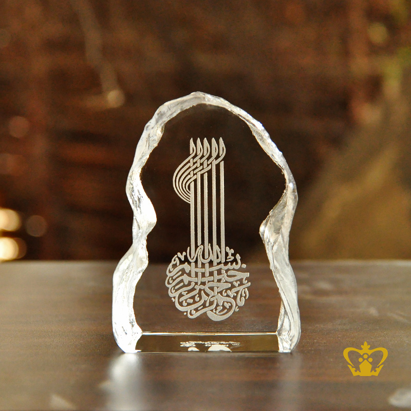 Crystal Gallery represent the craft traditions of the Islamic world with uncompromising quality and exceptional craftsmanship: to bring you a fine selection of unique handcrafted crystal corporate Islamic Gifts. Our Islamic artifacts gift decor collections are increasingly popular locally in Dubai, UAE, GCC and abroad. With a portfolio of high profile clients, our luxury giveaways have added the perfect awe-aspiring touch to many occasions and events. Our brand is widely recognized and endorsed by our clients for its classy Islamic gift collections and excellence of service. We design experiences in the world of luxury corporate gifts. This Modern Islamic Art handcrafted decorative item is the perfect addition to your home decor! Also can makes a great housewarming gift, Eid Gift, Ramadan Gift, Shahadah, gift for someone returning home from Hajj! Bismillah meaning "In the name of Allah". It is the first phrase in the Quran. The full sentence is Bismillah-ir-Rahman-ir-Rahim meaning "In the name of Allah, the Most Gracious, and the Most Merciful". Personalized / Customized content such as logos, text or pictures can be engraved / etched on the main body of this product at an additional charge.