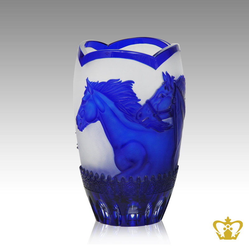 The vase beautifully depicts majestic horses drenched in blue, galloping in a group across the frosted surface. Crafted in lead crystal with our signature traditional and contemporary cutting patterns. Crystal Gallery's decorative vases collection is the epitome of strong craftsmanship. The handcrafted cuts in clear crystal and a shiny appeal give this crystal vase a traditional touch that is hard to be missed. This crystal vases makes a great housewarming gift or even ideal for any occasion. Our superior products are only produced by hand in a time consuming process, with excellence in every detail. Each high quality and exclusive crystal decorative vase is unique and is produced by the glasssmiths with the use of their extensive experience and skills. Elaborate finishing techniques are used, such as cutting, engraving and producing matt finishes, which gives Crystal Gallery its exceptional clarity and brilliance. Subtle, barely noticeable differences between the glasses are evidence of real hand-made products. Nizza, Dresden, Red Poppy, Tulipa or Luxury - all these sonorous collections are complemented by fascinatingly designed vases. They are a real feast for the eyes, which extremely intensify the effect of the flower arrangements arranged in them. With careful craftmanship and lots of love in the detail successfully creates an amazing crystal glass product like crystal vase and bowl. Because everything is made by hand and every glasssmith has much experience, one of a kind crystal glass products will be produced. The absolute perfection and craftsmanship of our crystal glass makers are reflected in all our crystal glass collections. Experience exclusive crystal glass, masterfully processed into sophisticated glasses, vases and bowls.
