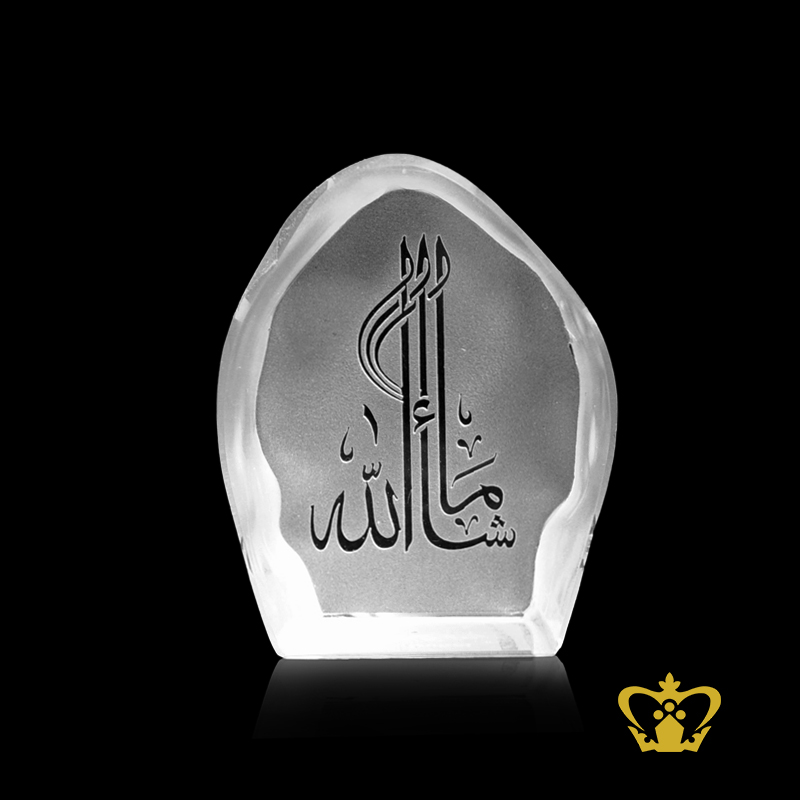 Crystal Gallery represent the craft traditions of the Islamic world with uncompromising quality and exceptional craftsmanship: to bring you a fine selection of unique handcrafted crystal corporate Islamic Gifts. Our Islamic artifacts gift decor collections are increasingly popular locally in Dubai, UAE, GCC and abroad. With a portfolio of high profile clients, our luxury giveaways have added the perfect awe-aspiring touch to many occasions and events. Our brand is widely recognized and endorsed by our clients for its classy Islamic gift collections and excellence of service. We design experiences in the world of luxury corporate gifts. This Modern Islamic Art handcrafted decorative item is the perfect addition to your home decor! Also can makes a great housewarming gift, Eid Gift, Ramadan Gift, Shahadah, gift for someone returning home from Hajj! Masha Allah also Masha'Allah, Ma shaa Allah is an Arabic phrase that is most often translated as "God has willed", "God willing" or "as God willed" and used to express appreciation, joy, praise, or thankfulness for an event or person that was just mentioned. Personalized / Customized content such as logos, text or pictures can be engraved / etched on the main body or base of this product at an additional charge.