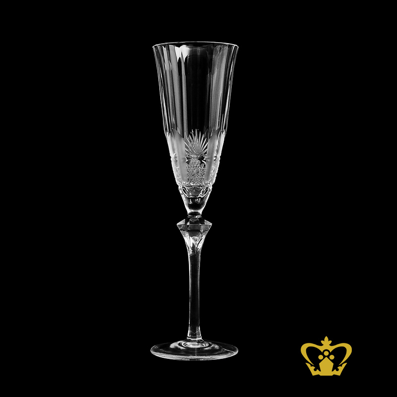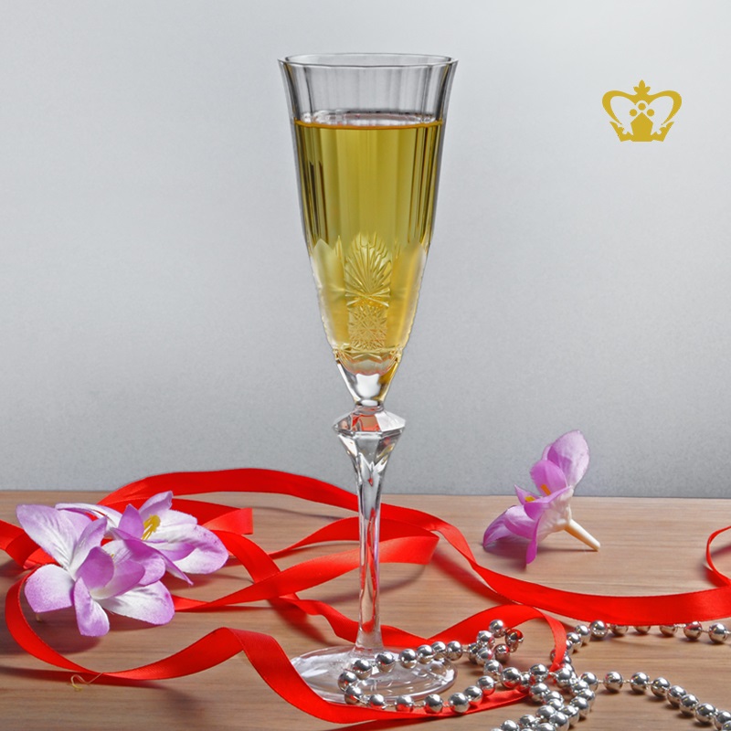 Crystal Gallery having stunning range of hand crafted crystal champagne flutes those are sure to be the perfect accompaniment to a party with friends, or a celebration with family. Toast and celebrate in style with our beautifully crafted crystal champagne glasses which are perfect for sparkling wine, champagne, mimosas and champagne cocktails. Our champagne flutes and toasting glasses boast a range of different styles from colored glass, intricately detailed cuts to contemporary handcrafted cutting patterns such as Kay, Pinwheel, Sapolic, Taj Mehrab, Star Jalli, Stuart, Aristocrat, etc and our wide range of shapes and designs are suited for everyday use as well as special occasions. Our champagne flutes make the perfect gift for all occasions including weddings, birthdays and anniversaries. Whether purchasing for yourself or someone else, our in-house engraving services now make it possible to personalize your champagne flutes or any bar glasses, decanter, stemware, vases, bowls and other gifts like never before. You can customize champagne glass with a message engraved with your text, add a name or include a date, for a keepsake present that they can use for years to come. Our personalized custom engraving options on champagne flutes having Icon or Logo with text, One Character Monogram, Two Character Monogram, Three character monogram etc. We having colored crystal champagne glasses includes gray, purple, red, lime green, amber and blue glasses. Makes a perfect housewarming, hostess or wedding gift.