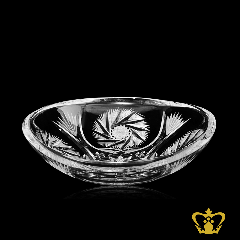 Clear round wide bowl with traditional twirling star handcrafted pattern .Crafted in lead crystal with our signature traditional and contemporary cutting patterns. The handcrafted cuts in clear crystal and a shiny appeal give this crystal bowl a traditional touch that is hard to be missed. This crystal bowls makes a great housewarming gift or even ideal for any occasion. Our superior products are only produced by hand in a time consuming process, with excellence in every detail. Each high quality and exclusive crystal decorative bowl is unique and is produced by the glasssmiths with the use of their extensive experience and skills. Elaborate finishing techniques are used, such as cutting, engraving and producing matt finishes, which gives Crystal Gallery its exceptional clarity and brilliance. Subtle, barely noticeable differences between the glasses are evidence of real hand-made products. Nizza, Dresden, Red Poppy, Tulipa or Luxury - all these sonorous collections are complemented by fascinatingly designed bowls. They are a real feast for the eyes, which extremely intensify the effect of the flower arrangements arranged in them. With careful craftmanship and lots of love in the detail successfully creates an amazing crystal glass product like crystal bowl and bowl. Because everything is made by hand and every glasssmith has much experience, one of a kind crystal glass products will be produced. The absolute perfection and craftsmanship of our crystal glass makers are reflected in all our crystal glass collections. Experience exclusive crystal glass, masterfully processed into sophisticated glasses, vases and bowls.