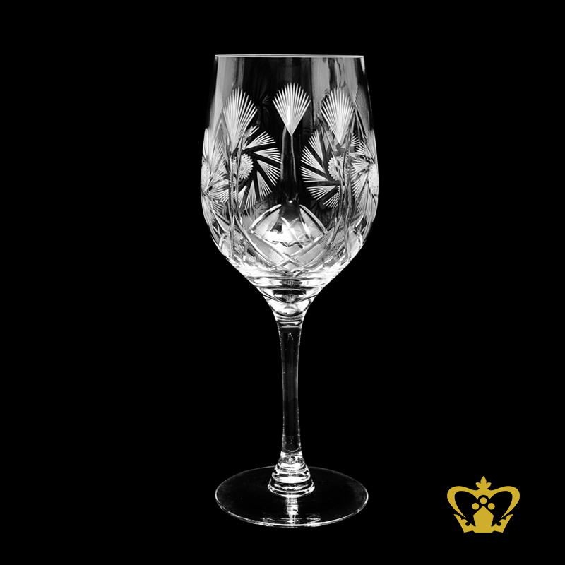 Handcrafted crystal burgundy glass with long stem and twirling star cuts on the goblet