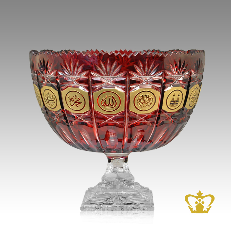 Deep Leaf Cross Cuts Decorative Islamic Religious Ramadan Eid Gifts Red Crystal Bowl footed Golden Arabic word Calligraphy Allah Muhammad the Holy Kaaba Bismillah Engraved