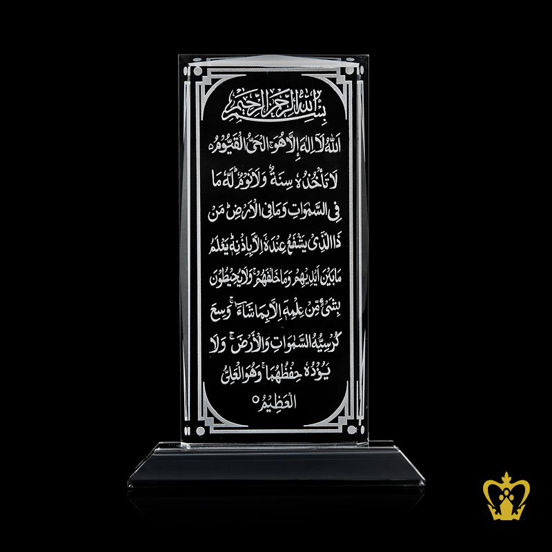 Crystal Gallery represent the craft traditions of the Islamic world with uncompromising quality and exceptional craftsmanship: to bring you a fine selection of unique handcrafted crystal corporate Islamic Gifts. Our Islamic artifacts gift decor collections are increasingly popular locally in Dubai, UAE, GCC and abroad. With a portfolio of high profile clients, our luxury giveaways have added the perfect awe-aspiring touch to many occasions and events. Our brand is widely recognized and endorsed by our clients for its classy Islamic gift collections and excellence of service. We design experiences in the world of luxury corporate gifts. This Modern Islamic Art handcrafted decorative item is the perfect addition to your home decor! Also can makes a great housewarming gift, Eid Gift, Ramadan Gift, Shahadah, gift for someone returning home from Hajj! The Throne Verse Ayat al Kursi is the 255th verse of the 2nd surah of the Quran, Al-Baqara. The verse speaks about how nothing and nobody is regarded to be comparable to God. It is one of the best-known verses of the Quran and is widely memorized and displayed in the Islamic world."Personalized / Customized content such as logos, text or pictures can be engraved / etched on the main body of this product at an additional charge.