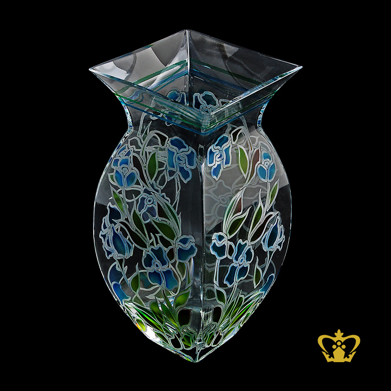 Gorgeous square curved crystal vase decorated with floral blue and green pattern modish elegant decorative piece