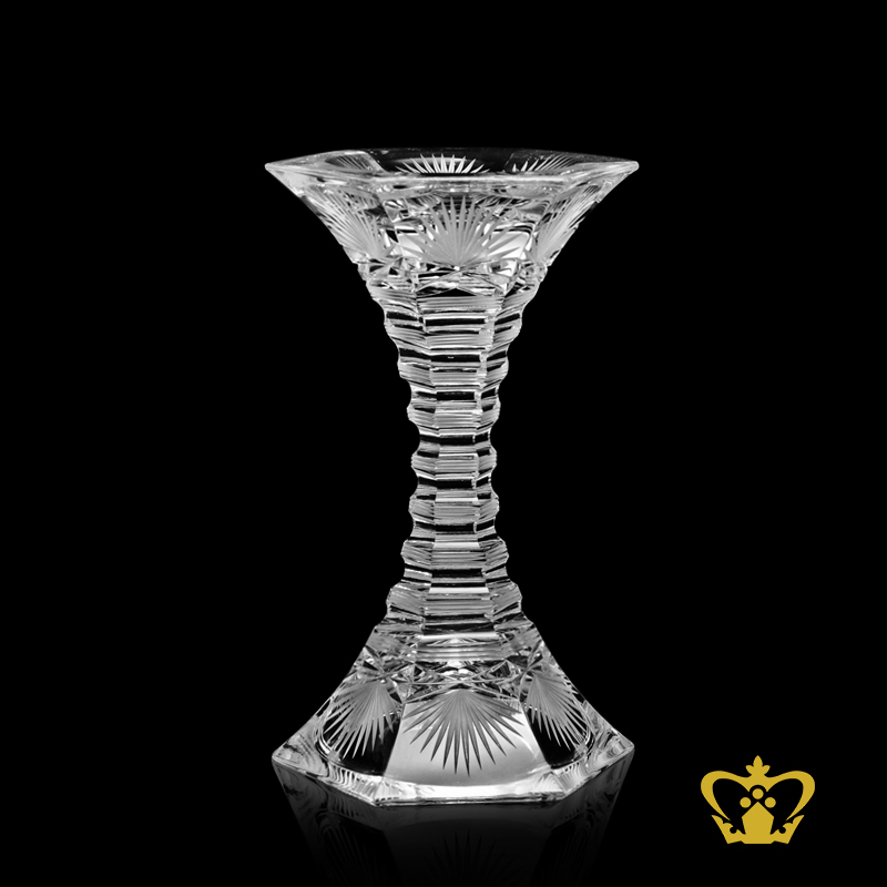 Classy modish hand crafted candle holder. Crafted in lead crystal with our signature traditional and contemporary designs. Crystal Gallery's decorative candle stand collection is the epitome of strong craftsmanship. The handcrafted cuts in clear crystal and a shiny appeal give this crystal candle stand a traditional touch that is hard to be missed. This crystal candle stand makes a great housewarming gift or even ideal for any occasion. Our superior products are only produced by hand in a time consuming process, with excellence in every detail. Each high quality and exclusive crystal decorative candle holder is unique and is produced by the glasssmiths with the use of their extensive experience and skills. Elaborate finishing techniques are used, such as cutting, engraving and producing matt finishes, which gives Crystal Gallery its exceptional clarity and brilliance. With careful craftsmanship and lots of love in the detail successfully creates an amazing crystal product like crystal candle stand. Because everything is made by hand and every glasssmith has much experience, one of a kind crystal products will be produced. The absolute perfection and craftsmanship of our crystal glass makers are reflected in all our crystal collections. Experience exclusive crystal gifts, masterfully processed into sophisticated candle stand.