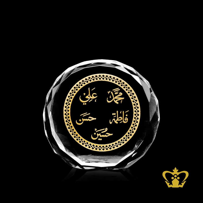 Round Crystal Paper Weight with Diamond cut and engraved Panjtan Ahl Al-kisa