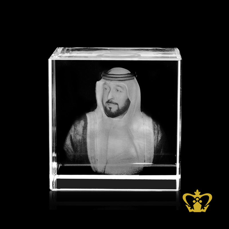 Khalifa bin Zayed bin Sultan Al Nahyan is the current President of the United Arab Emirates, the Emir of Abu Dhabi, the Supreme Commander of the Union Defence Force and the chairman of the Supreme Petroleum Council. You can personalize this crystal cube or rectangular crystal block by engrave your own photo, logo, text, design or any ideas. Click on customize button and upload your image or text and buy online, you can also click on enquiry button we will respond as soon as we can. To produce a 3D crystal, firstly our designers transform any of your ordinary photographs into amazingly 3D images. Then it imprinted or engraved in glass cube using our precision laser technology in crystal cube. 3D crystal cube or blocks are often used for 3D or 2D crystal portraits and given as gifts for wedding, birthdays, Valentine's Day, mother's day, father's day, graduation, convocation , remembrance, memorial or anniversary gift. There are also great corporate or business gifts for recognition awards, promotional paperweights and event mementos. Corporate logos laser engraved inside of the crystal make elegant client and employee gifts. These laser crystals accommodate 3D layered designs where text and image can be engraved at different depths in the crystal. You can add an optional light base and the interaction of the white LED light with the engraving creates bright and sparkling 3D keepsake.