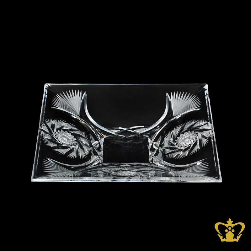 The shapely table accessory is etched with large Suraj cuts along two sides. Specially handcrafted unique square crystal centerplate a lovely decorative gift. Crafted in lead crystal with our signature traditional and contemporary designs. Crystal Gallery's decorative centerplate collection is the epitome of strong craftsmanship. The handcrafted cuts in clear crystal and a shiny appeal give this crystal plate a traditional touch that is hard to be missed. This crystal decorative centerplate makes a great housewarming gift or even ideal for any occasion. Our superior products are only produced by hand in a time consuming process, with excellence in every detail. Each high quality and exclusive crystal decorative center plate is unique and is produced by the glasssmiths with the use of their extensive experience and skills. Elaborate finishing techniques are used, such as cutting, engraving and producing matt finishes, which gives Crystal Gallery its exceptional clarity and brilliance. With careful craftsmanship and lots of love in the detail successfully creates an amazing crystal product like crystal center plates. Because everything is made by hand and every glasssmith has much experience, one of a kind crystal products will be produced. The absolute perfection and craftsmanship of our crystal glass makers are reflected in all our crystal collections. Experience exclusive crystal gifts, masterfully processed into sophisticated crystal centerplates