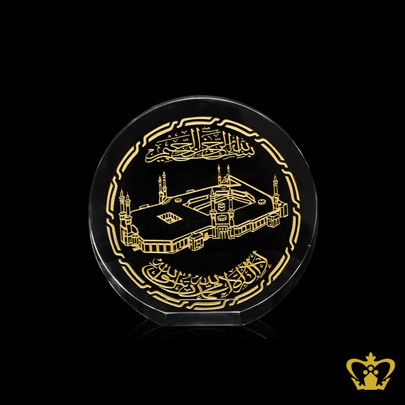 Golden-Arabic-Word-Calligraphy-Bismillah-Ir-Rahman-Ir-Rahim-And-La-Ilaha-Illa-Allah-Muhammed-Rasul-Allah-With-Holy-Kaaba-Engraved-Islamic-Occasions-Gift-Crystal-round-Paper-weight-Customized-Ramadan-Eid-Religious-Souvenir Product Product Product