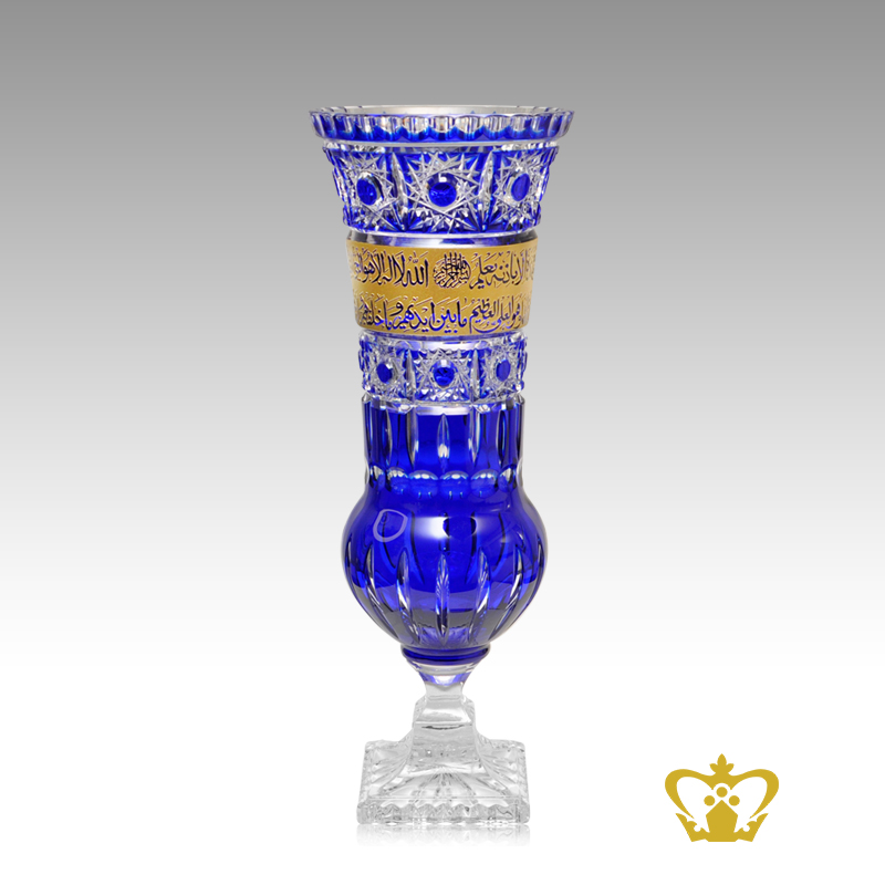 Blue Crystal Vase Footed Hand crafted Deep Star Cuts Golden Arabic word Calligraphy Ayat Al Kursi Engraved Islamic Decorative Present Religious Ramadan Souvenir Eid Gift