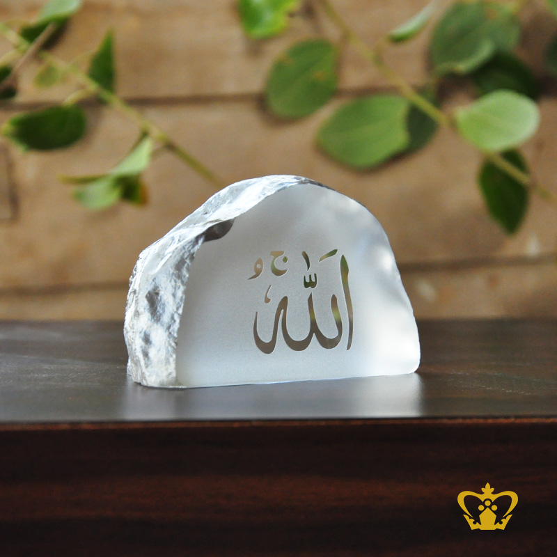 Crystal Gallery represent the craft traditions of the Islamic world with uncompromising quality and exceptional craftsmanship: to bring you a fine selection of unique handcrafted crystal corporate Islamic Gifts. Our Islamic artifacts gift decor collections are increasingly popular locally in Dubai, UAE, GCC and abroad. With a portfolio of high profile clients, our luxury giveaways have added the perfect awe-aspiring touch to many occasions and events. Our brand is widely recognized and endorsed by our clients for its classy Islamic gift collections and excellence of service. We design experiences in the world of luxury corporate gifts. This Modern Islamic Art handcrafted decorative item is the perfect addition to your home decor! Also can makes a great housewarming gift, Eid Gift, Ramadan Gift, Shahadah, gift for someone returning home from Hajj! Allah is the standard Arabic word for God in Islam, Allah is the absolute one, the all-powerful and all-knowing ruler of the universe, and the creator of everything in existence. According to Islamic teachings, beyond the Throne and according to the Quran, "No vision can grasp him, but His grasp is over all vision He is above all comprehension, yet is acquainted with all things."Personalized / Customized content such as logos, text or pictures can be engraved / etched on the main body of this product at an additional charge.