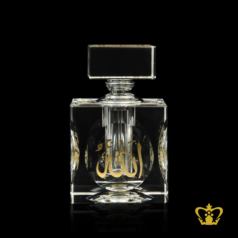 Perfume Bottle Crystal Islamic Occasions Gift Engraved With Arabic Word Calligraphy In Golden Color Bismillah Allah Muhammed Rasul Allah And The Holy Kaaba Ramadan Eid Religious Souvenir