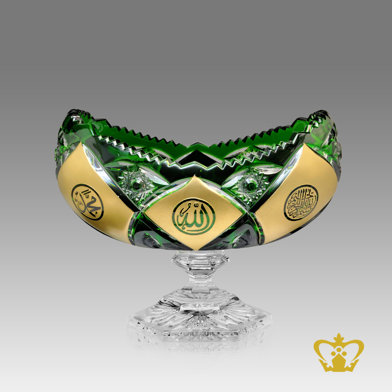Classy charming scalloped edge green footed crystal Islamic bowl with Arabic word calligraphy engraved Allah Muhammed Rasulullah Bismillah and handcrafted diamond pattern decorative gift