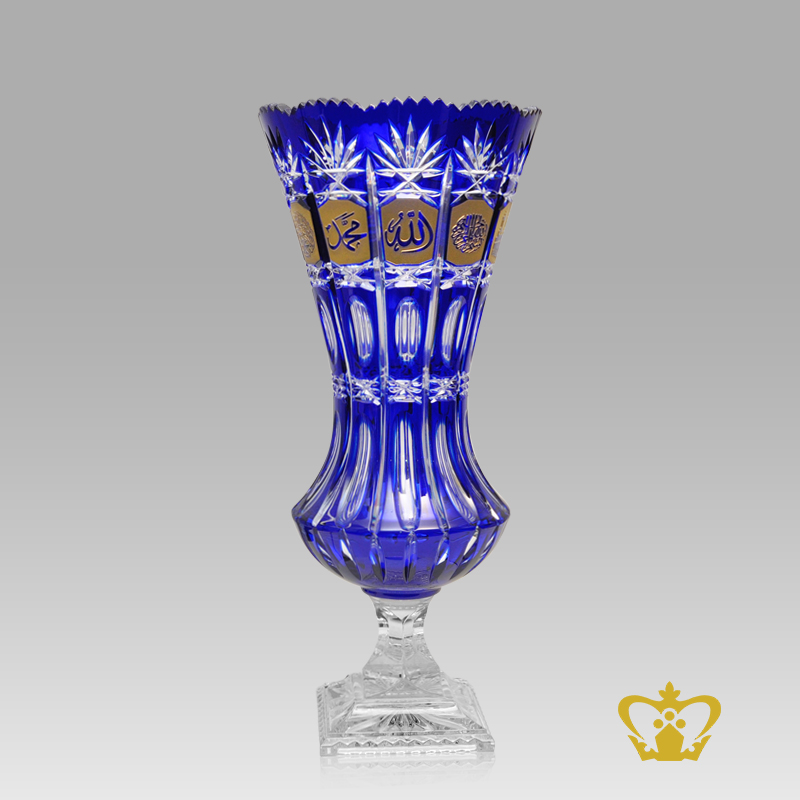 Blue crystal footed vase golden Arabic word calligraphy engraved deep leaf cuts decorative Islamic religious occasion Ramadan Eid gifts