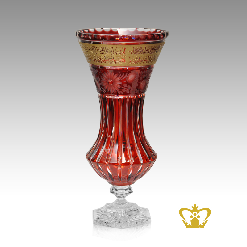 Ruby crystal decorative vase golden Arabic word Ayat Al Kursi engraved deep flower cuts handcrafted Islamic souvenir religious occasions Ramadan Eid gifts