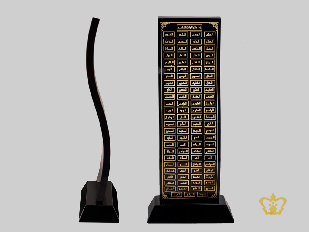 Asma Ul Husna - 99 most beautiful names of Allah are etched tastefully in a golden hue upon black crystal. Crystal Gallery represent the craft traditions of the Islamic world with uncompromising quality and exceptional craftsmanship: to bring you a fine selection of unique handcrafted crystal corporate Islamic Gifts. Our Islamic artifacts gift decor collections are increasingly popular locally in Dubai, UAE, GCC and abroad. With a portfolio of high profile clients, our luxury giveaways have added the perfect awe-aspiring touch to many occasions and events. Our brand is widely recognized and endorsed by our clients for its classy Islamic gift collections and excellence of service. We design experiences in the world of luxury corporate gifts. This Modern Islamic Art handcrafted decorative item is the perfect addition to your home decor! Also can makes a great housewarming gift, Eid Gift, Ramadan Gift, Shahadah, gift for someone returning home from Hajj! 99 Names of Allah. Allah has revealed His names repeatedly in the Holy Quran primarily for us to understand who he is. Learning and memorizing the names of Allah will help us to identify the correct way to believe in Him.Personalized / Customized content such as logos, text or pictures can be engraved / etched on the main body of this product at an additional charge.