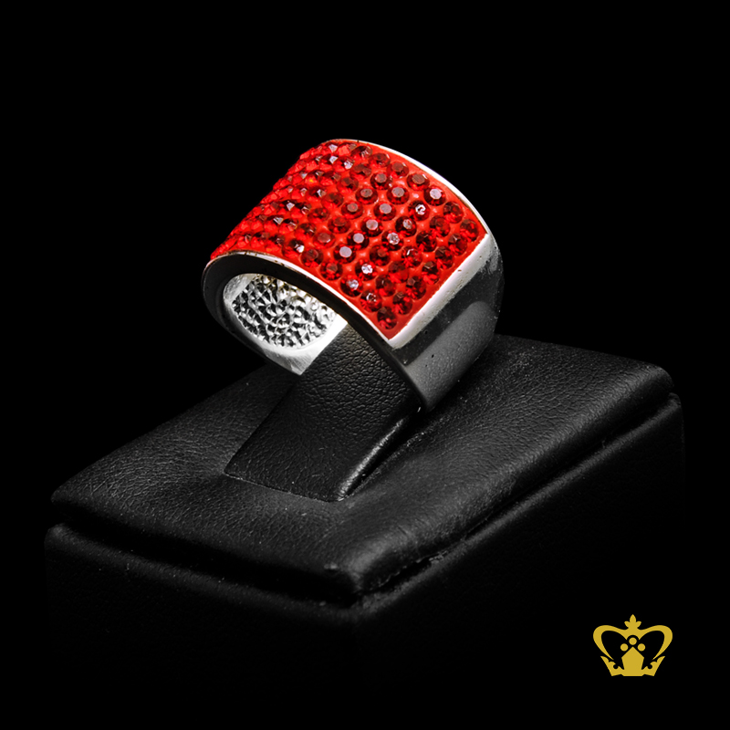 Shimmering silver ring inlaid with red shiny crystal diamonds sparkling gift for her
