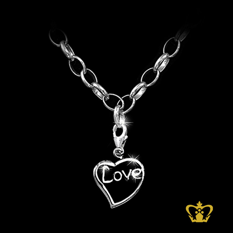 Dot the loops of your silver bracelet with a heart-shaped charm that's wrapped around the word 'love'.
