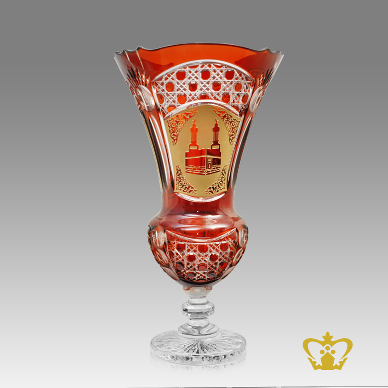 Allah the Holy Kaaba Engraved Decorative Islamic Religious Ramadan Eid Gifts Footed Red Crysal Vase Handcrafted Deep Diamond Leaf cuts Golden Arabic word Calligraphy