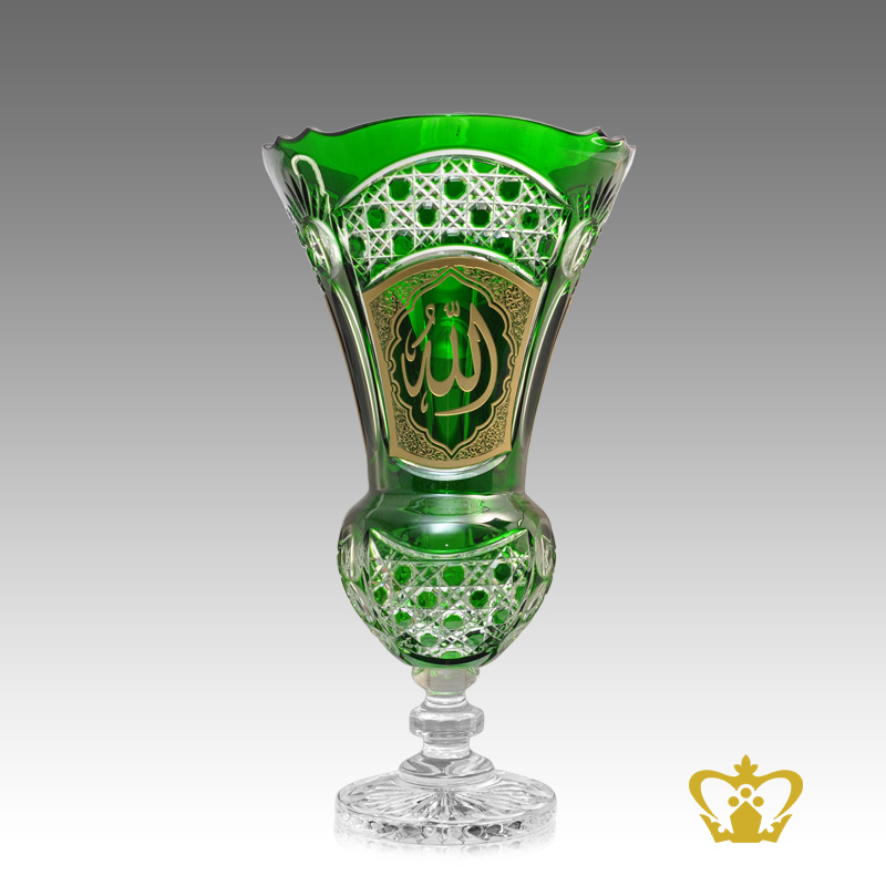 Footed Green Crystal Vase Handcrafted Deep Diamond Leaf cuts Golden Arabic word Calligraphy Allah the Holy Kaaba Engraved Decorative Islamic Religious Ramadan Eid Gifts