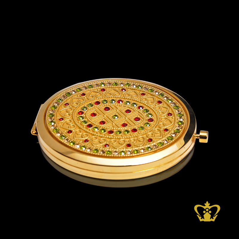 Oval-golden-small-compact-ladies-mirror-embellish-with-green-red-and-clear-crystal-diamond Product Product