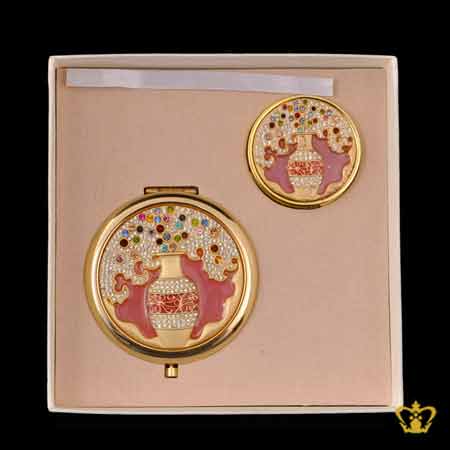 Round-golden-beautiful-vase-design-small-compact-ladies-mirror-and-purse-holder-embellish-with-multicolor-crystal-diamond Product