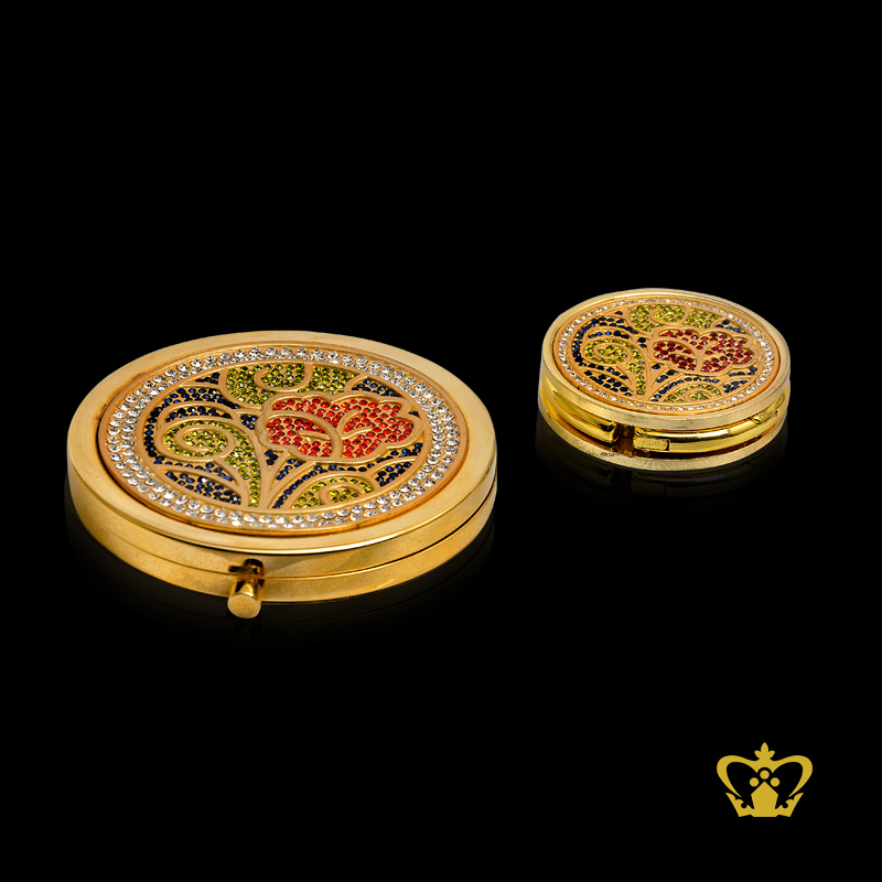 Round-golden-tree-design-small-compact-ladies-mirror-and-purse-holder-embellish-with-multicolor-crystal-stone Product Product Product