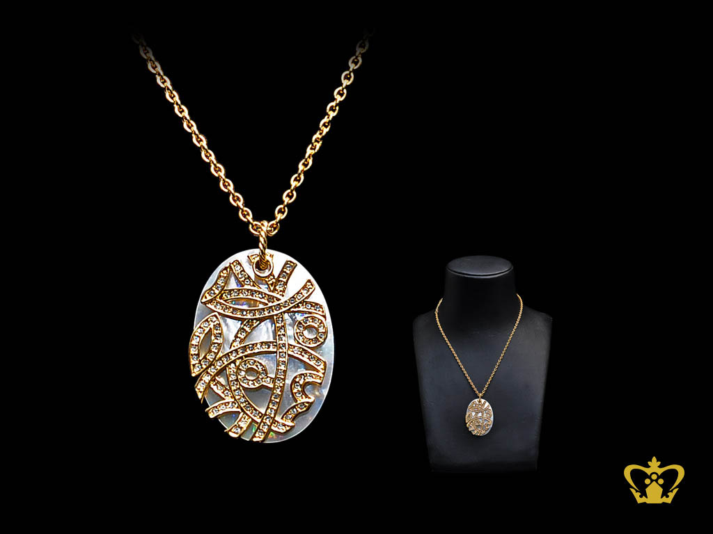 Oval shape mother of the pearl pendant on golden chain embellish with clear crystal stone