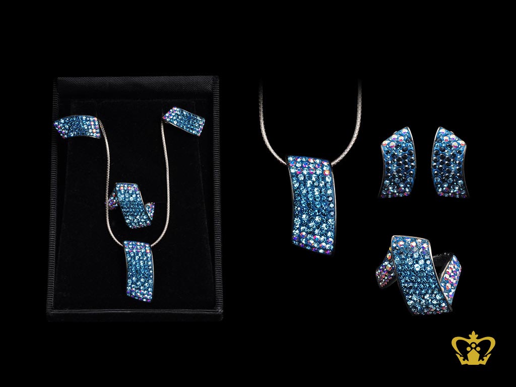 Elegant gorgeous set of jewelry curve pendant earring and ring embellished with blue crystal diamond