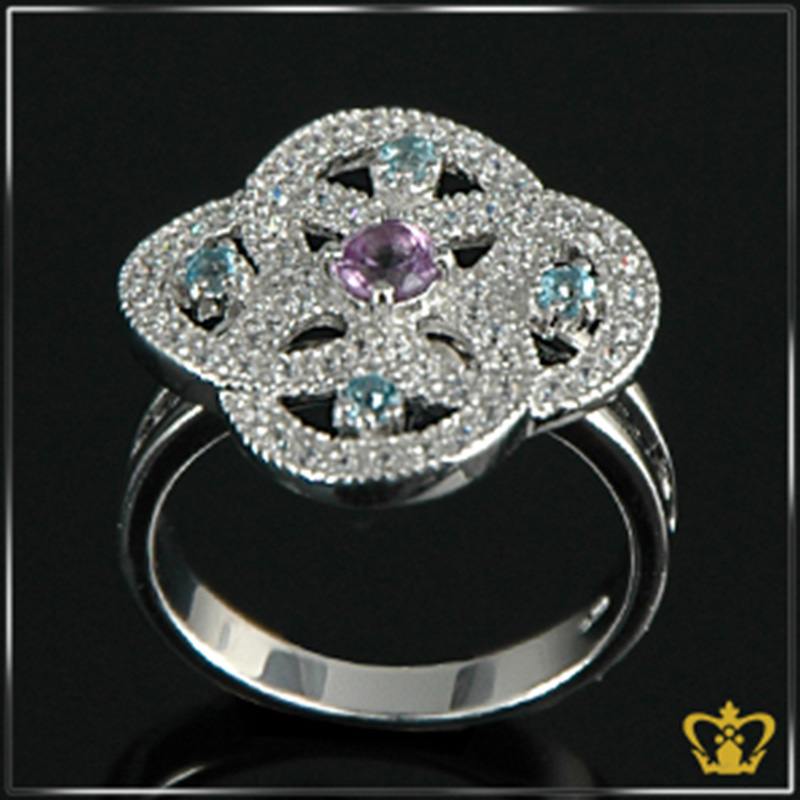 Flower ring silver embellished with sparkling colorful crystal diamond