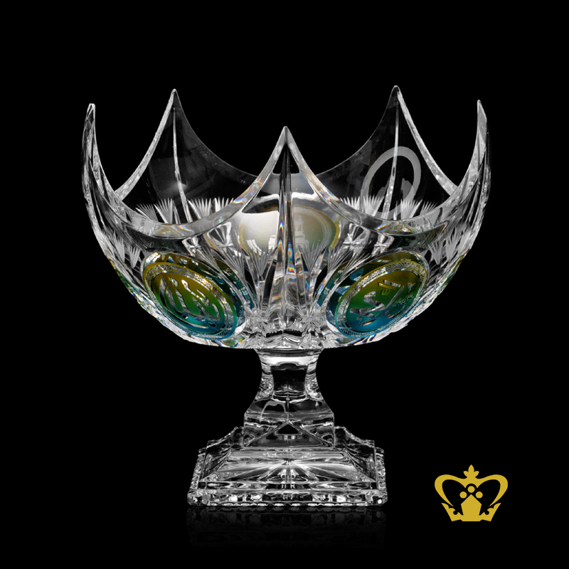 Crown edged Footed Crystal Rose Bowl Hand Crafted with Deep leaf cuts Arabic Word calligraphy engraved Allah Muhammed the Holy Kaaba in Assorted colors Islamic Occasions Gift Eid Ramadan Souvenir
