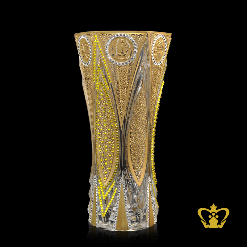 Allah Muhammad Rasul Allah Arabic Golden Word Calligraphy Engraved Decorative Crystal Vase with Diamonds Deep Leaf Cuts Handcrafted Islamic Souvenir Religious Ramadan Present Eid Gift
