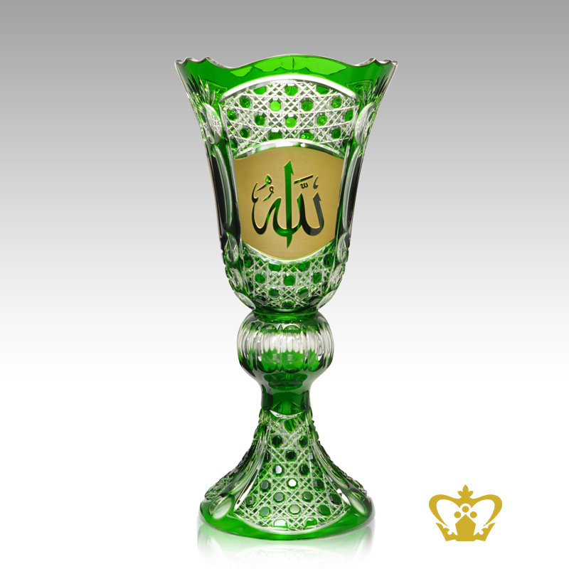 2 Tier Green Crystal Decorative Vase Arabic word Golden Calligraphy Allah Engraved Hand crafted Deep Diamond Leaf Cuts Islamic religious Ramadan Eid Gifts