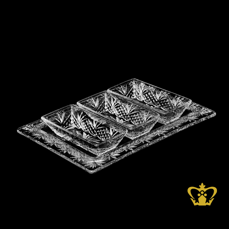 Classic-ornate-crystal-tray-with-3-nut-bowls-allured-with-exquisite-hand-carved-leaf-diamond-pattern Product Product Product