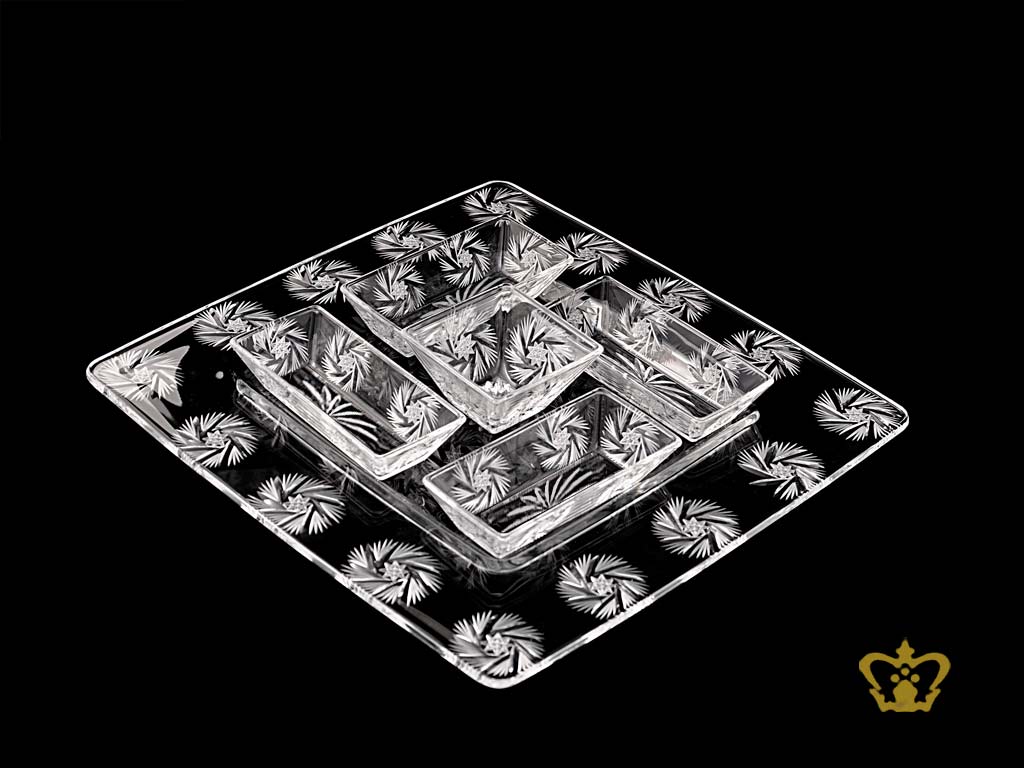 Traditional-twirling-star-pattern-classic-ornate-crystal-tray-with-5-nut-bowls-allured-with-lovely-hand-carved-design Product