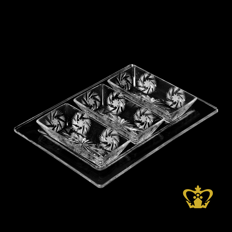 Modish adorned crystal tray with 3 nut bowls allured with exquisite hand carved twirling star pattern