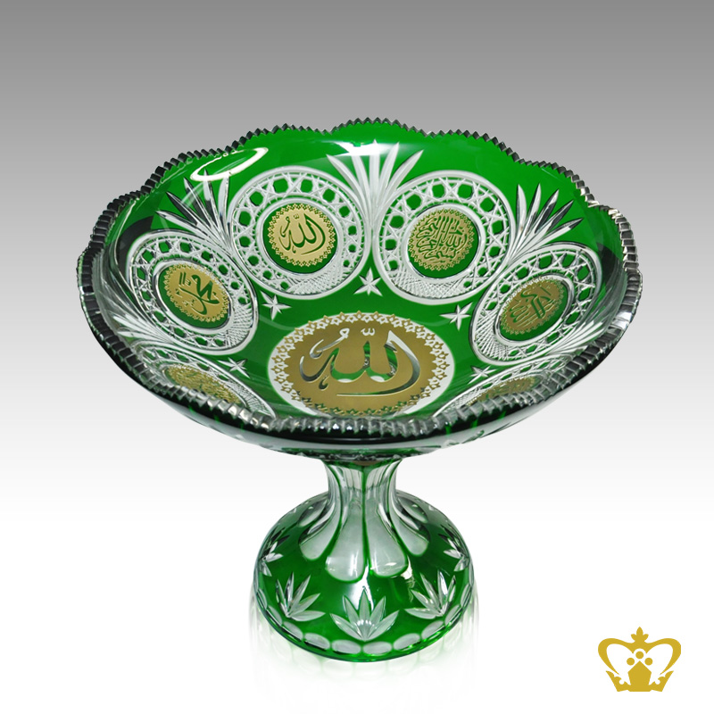 Footed Green Crystal Bowl Deep Leaf Diamond Cuts Arabic Word Calligraphy Engraved Allah Muhammad Allah Akbar Bismillah Engraved Decorative Islamic Religious Ramadan Eid Gifts