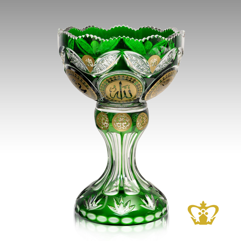 Green Footed Crystal Bowl Golden Arabic Word Calligraphy Allah Engraved Decorative Handcrafted Deep Leaf Cuts Islamic Religious Ramadan Eid Gifts