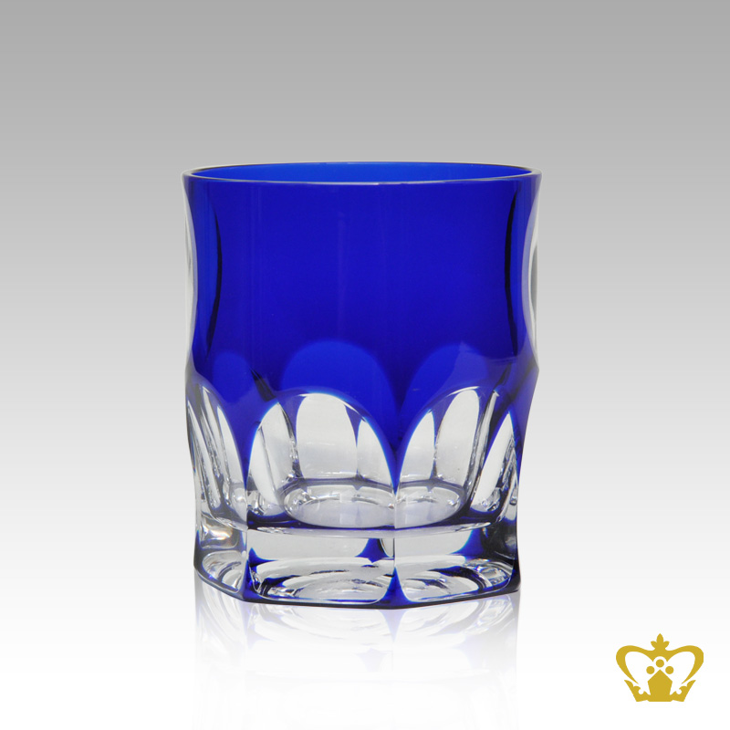 Timless blue crystal whiskey tumbler adorned with precious clear deep wide curved facets pattern 10 oz