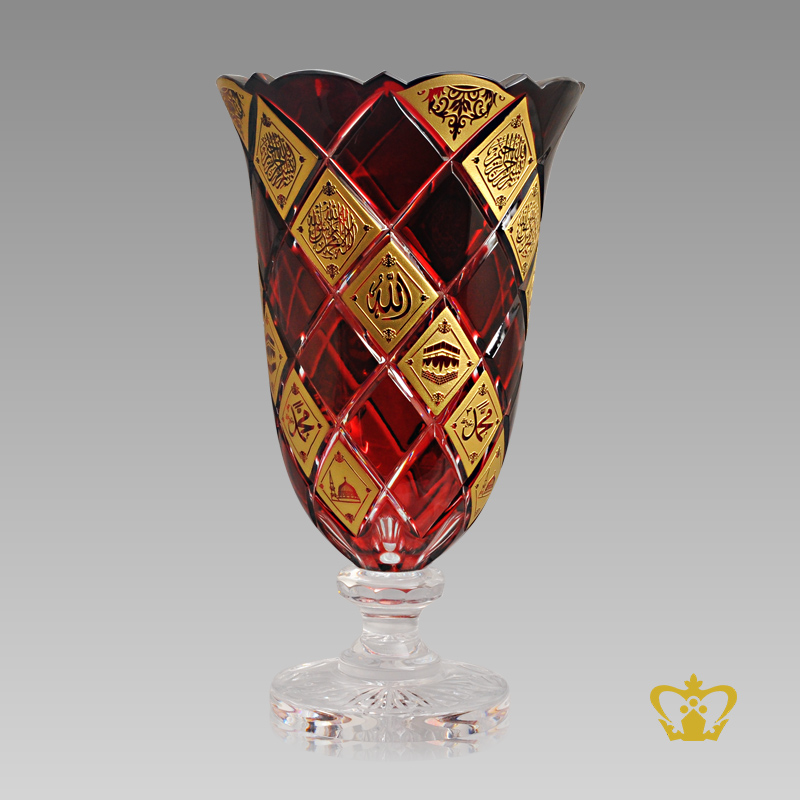 Ruby Red Crystal Vase Footed with Deep Cross cuts Crown Edged Handcrafted Islamic Decorative Present Golden Arabic word Engraved Allah Muhammad Ramadan Souvenir Eid Gift